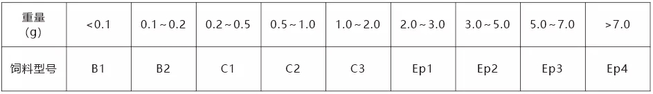 飼料適口性對石斑魚攝食及采食量產生很大影響,而飼料顆粒大小占飼料適口性很大一部分,在不同體重下對應飼料規格見下表。