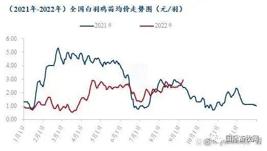 由上圖可見,全國白羽雞苗均價(jià)已連續(xù)4天呈現(xiàn)上行趨勢(shì),據(jù)Mysteel農(nóng)產(chǎn)品數(shù)據(jù)統(tǒng)計(jì),截至2022年9月7日全國白羽雞苗均價(jià)漲至2.94元/羽,較2021年同期苗價(jià)上調(diào)0.55元/羽,漲幅23.01%。