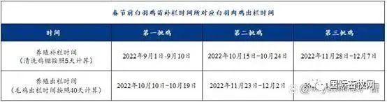 其次,從春節(jié)前白羽肉雞出欄批次來看,結(jié)合白羽肉雞主產(chǎn)區(qū)山東市場的情況,毛雞養(yǎng)殖出欄時(shí)間按照40天計(jì)算,清洗雞棚時(shí)間按照5天計(jì)算,那么從9月份至春節(jié)前最大極限可出三批雞,第一批雞的補(bǔ)欄時(shí)間約從2022年9月1日至9月10日;第二批雞補(bǔ)欄階段約在2022年10月15日至10月24日;第三批雞補(bǔ)欄時(shí)間或在2022年11月28日至12月7日。