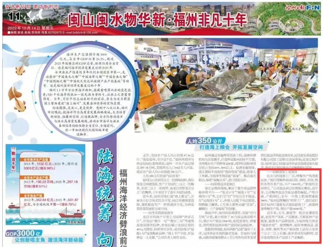 天馬科技訊 1014日,福州日報刊登專版報道《閩山閩水物華新 福州非凡十年》,報道了天馬科技集團布局鰻魚食品全產業鏈,以高品質預制菜向精深加工要效益,引領國鰻崛起,引發了社會的廣泛關注。報道如下↓↓↓